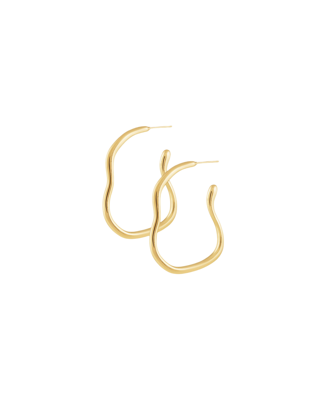 Curved hoop earrings crafted from 18K gold-plated stainless steel, featuring a unique sculptural silhouette that blends bold style with refined elegance. Hypoallergenic, water- and tarnish-resistant—perfect for making a statement from day to night.