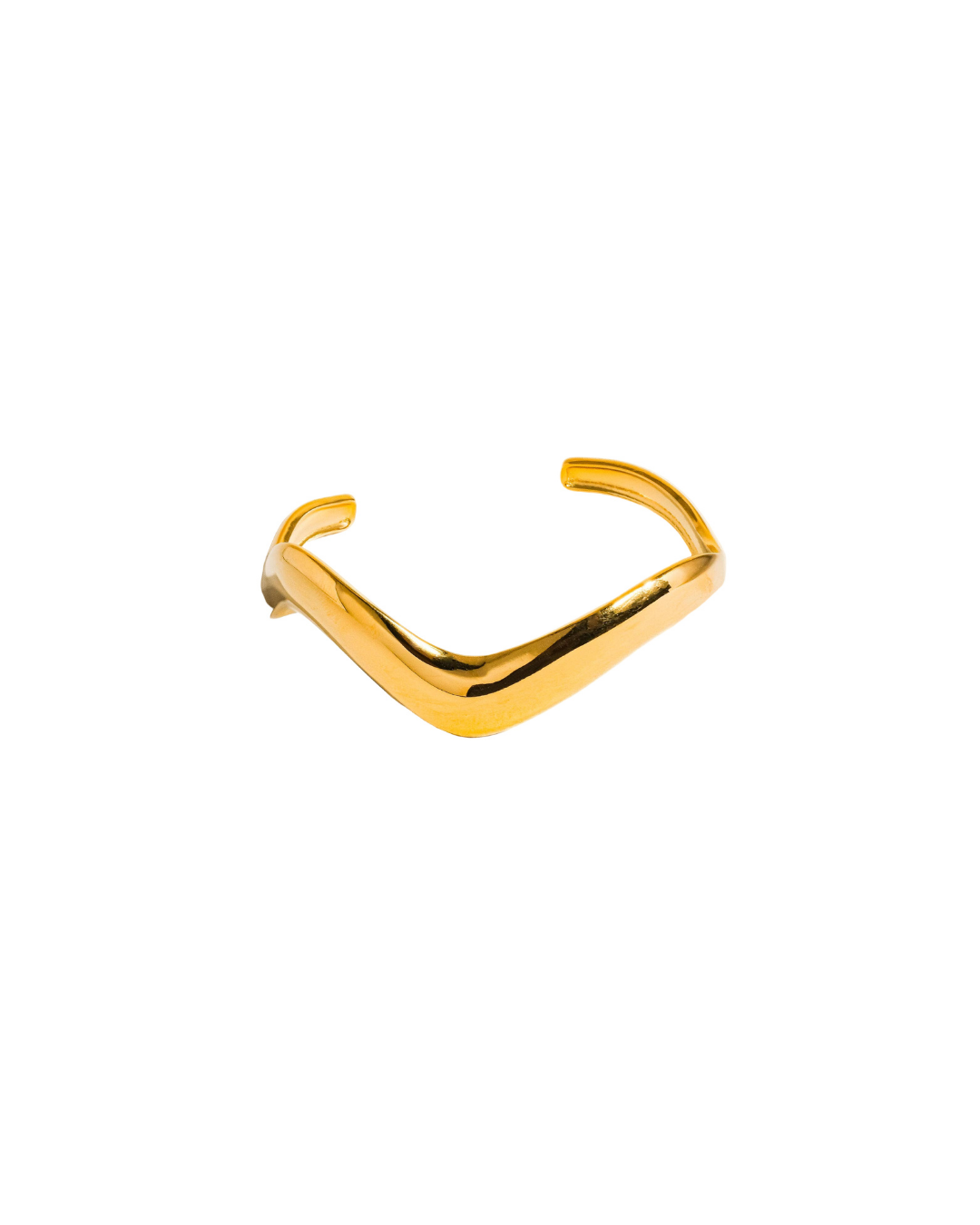 Sleek V-shaped bangle bracelet crafted from 18K gold-plated stainless steel, featuring a minimalist design with contemporary edge. Hypoallergenic, water- and tarnish-resistant—perfect for versatile styling, layering, or wearing solo for effortless sophistication.
