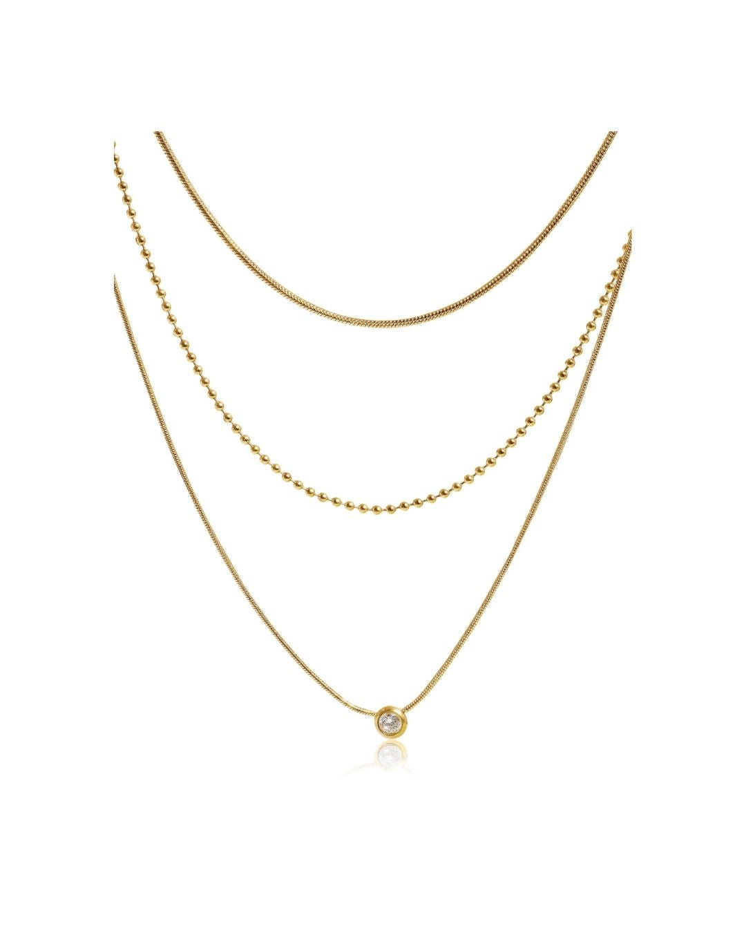 Elevate your neckline with the Celestine Trilayer CZ Chain Necklace, a radiant trio of chains featuring sparkling heart-shaped cubic zirconia pendants.