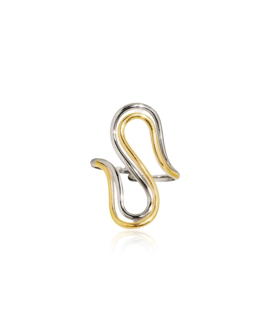 The Mira Ring features a sculptural two-tone silhouette with fluid curves and modern asymmetry.