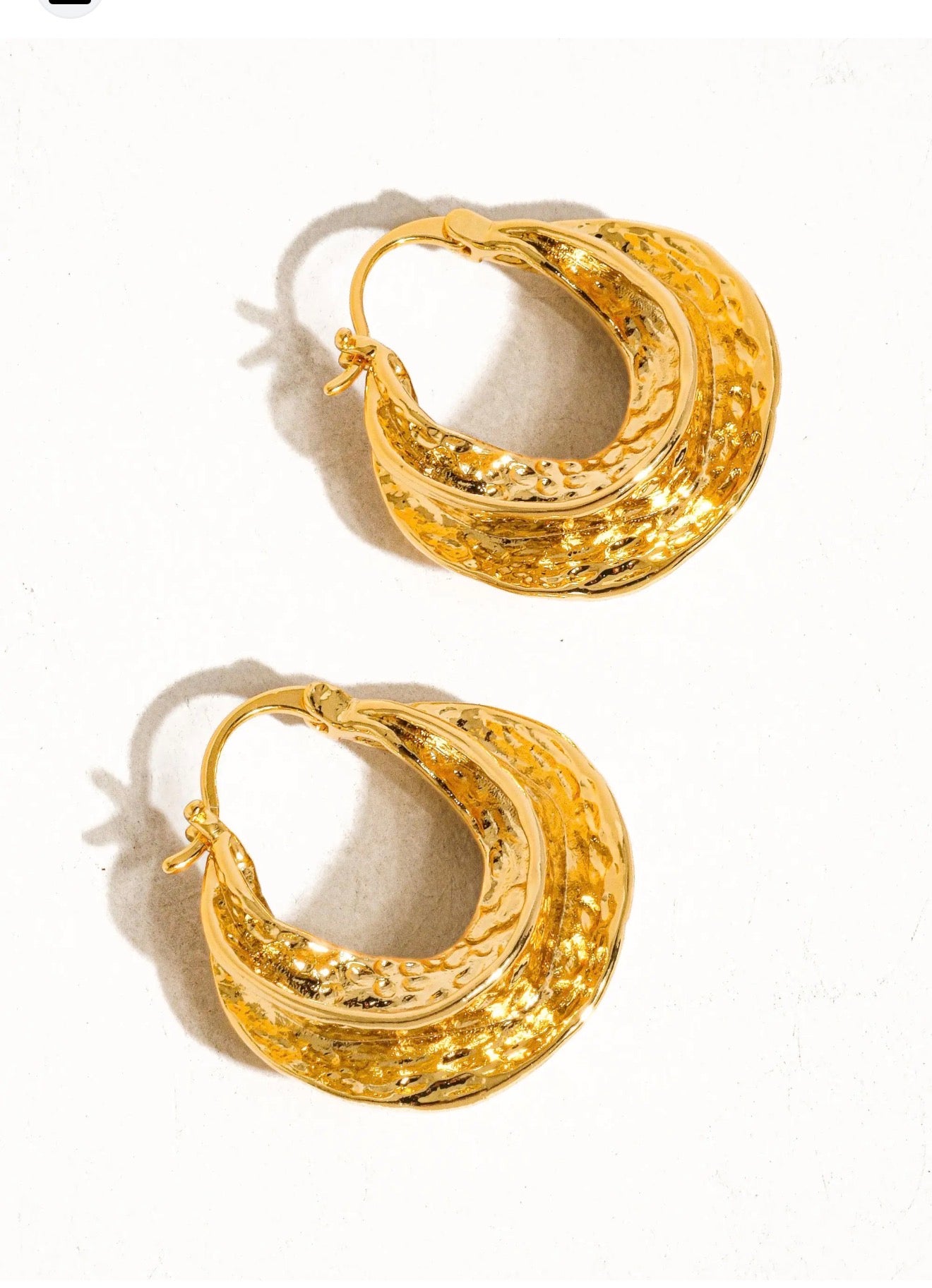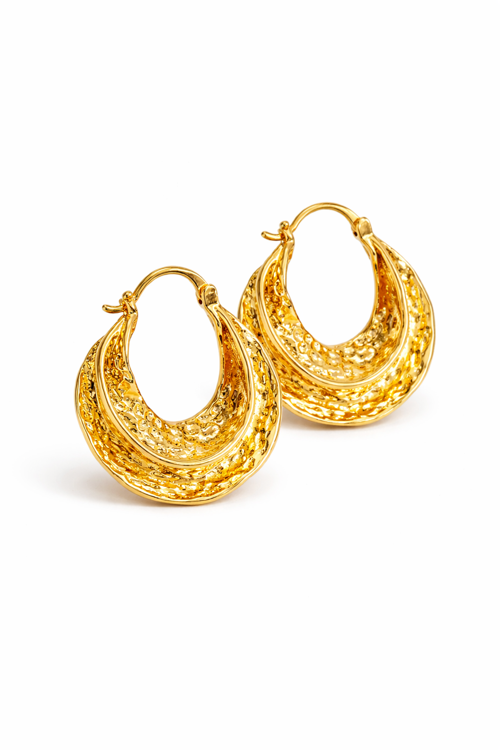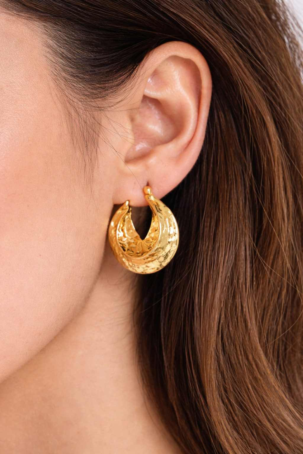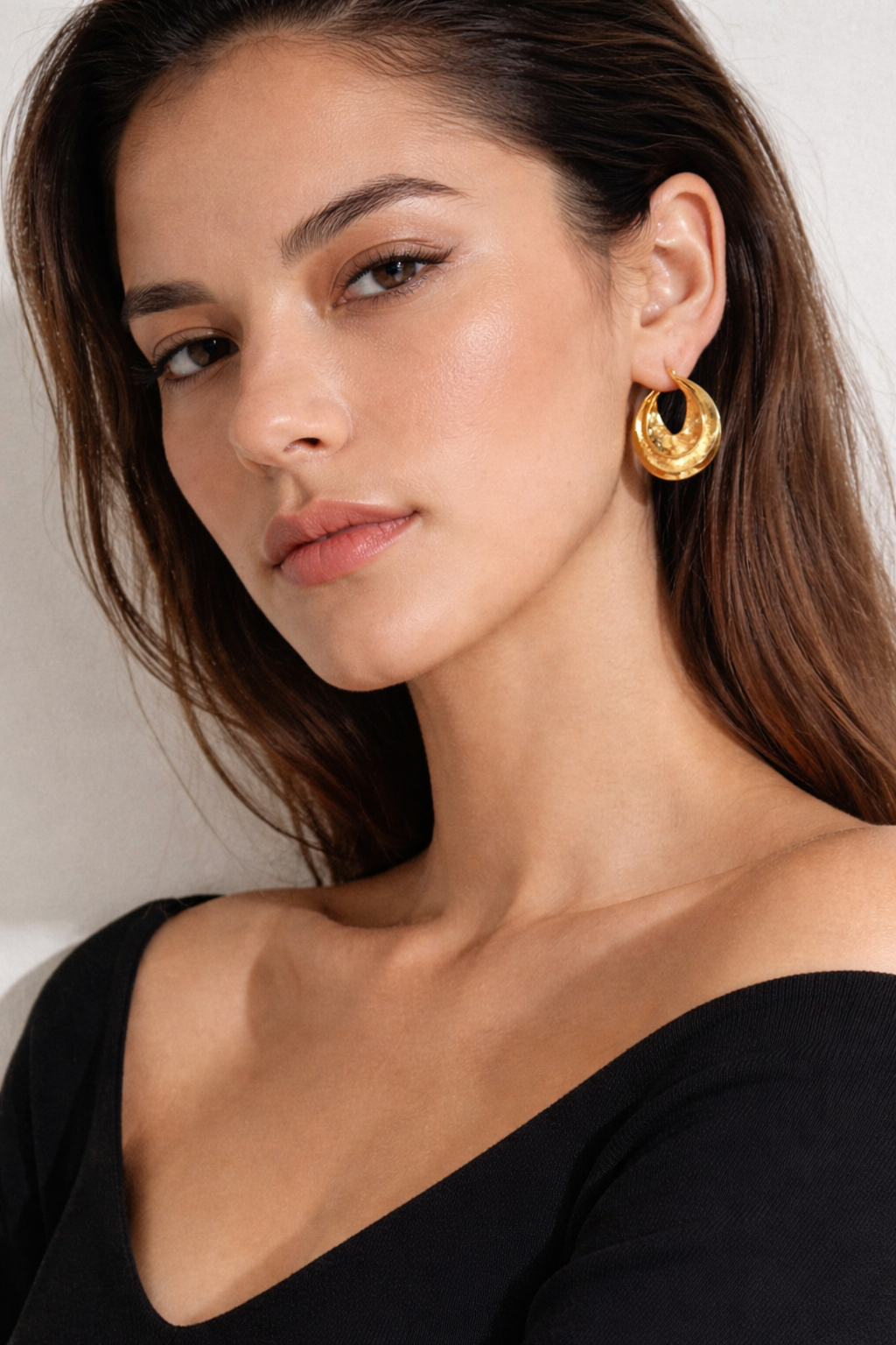 A sculptural statement, the Calista Swirl Hoop Earrings feature a fluid twisted silhouette finished in radiant gold — bold, elegant, and effortlessly chic.