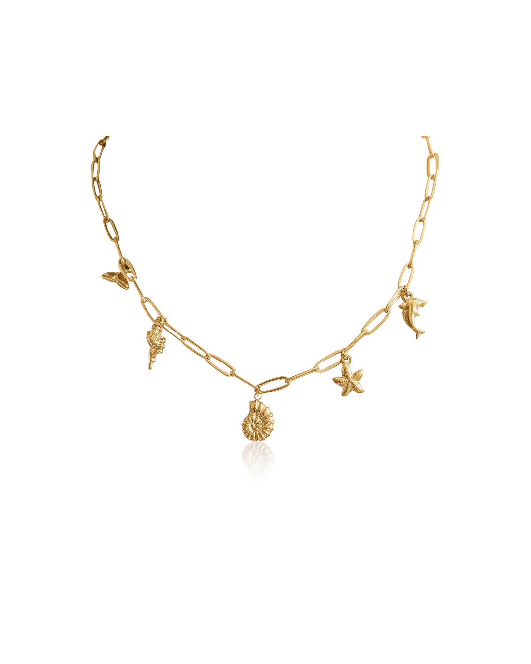 A modern heirloom, the Ocean Charm Necklace features a delicate stainless steel chain adorned with shell, dolphin, and starfish pendants — a coastal-inspired piece perfect for gifting.
