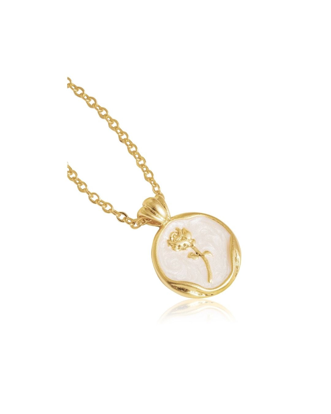 Delicate necklace crafted from 18K gold-plated brass, featuring a rose-engraved coin pendant (approx. 1.3cm diameter) on a fine chain measuring 40cm with a 5cm extender. Hypoallergenic, water- and tarnish-resistant—perfect for adding a timeless symbol of beauty and femininity to any look.