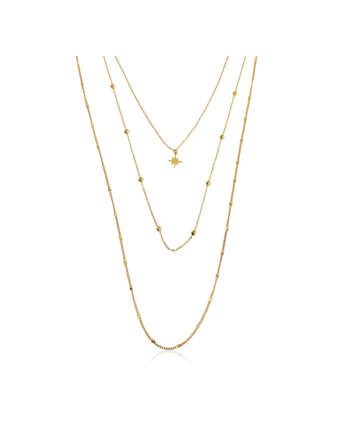 Celestial Triple Star Necklace. Gold-plated, hypoallergenic & tarnish-resistant, featuring layered chains for an elegant, stacked look.