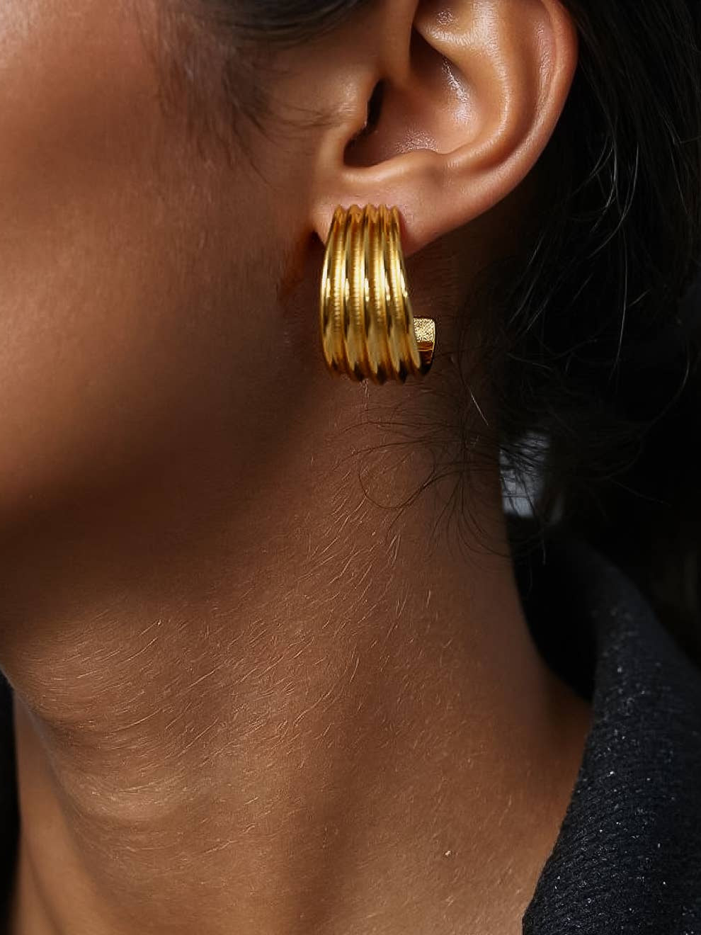 A confident statement, the Rowan Ribbed Hoop Earrings feature a wide, textured silhouette finished in polished gold — bold, modern, and effortlessly chic.